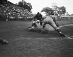 The Fort Worth Cats hosted the Tulsa Oilers at LaGrave Field. Monty Basgall slid home with the winning run as the Cats edged out Tulsa, 3-2. The Oilers catcher, Leonard Greene, attempted to block the plate and apply the tag. Umpire Lou Smith crouched on the third base side of the plate, in perfect position to make the "safe" call. The winning run was set up by Jay Haney's bunt.