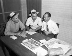 Edward Monroe Moore, right, former ambulance driver and an escapee from jail in Holdenville, Oklahoma three weeks ago, was arrested in Fort Worth, August 3. He is talking to Deputy Sheriff Wilson, left, and Deputy Farris and recounting how he watched two men dump the body of a man into the water of Lake Worth. The deputies are listening and taking notes. On the table are newspapers and other documents. Published in the Fort Worth Star-Telegram morning edition, August 5, 1946.