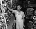 W. L. Redford, manager of Hudson Grocery and Market shown in his store after airplane accident.
