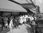Opening day of the R. E. Cox Dry Goods Company. A view of the crowd of men and women waiting at the entrance for the opening. The line is large and almost completely covers the storefront.