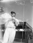 Fort Worth Cats pitcher, Eddie Chandler, demonstrates one of his pitching "ticks," He keeps a small face towel in his pocket for when the Texas summer gets to him. He tucks his glove under his left elbow and stops pitching to dry his neck. Chandler is standing in the bullpen, dressed in the Cats' home uniform. The grandstands and the right field foul pole are behind him.