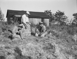 Mrs. N. O. Kreager death scene outside of Sherman, Texas. Deputy Sheriff J. O. Vaughan (center) holds a wooden top to the well while Highway Patrolmen A. D. Lummuns (left) and T. M. Rains peer into the dray well where Mrs. Kreager's body was found.