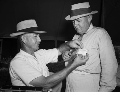 Glen Garden invitation tournament. W. R. Lynn, secretary of Glen Garden Country Club, seen pinning badge on Doctor Alden Coffey, president of the Fort Worth Gold Association.