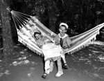 The Camp Fire Girls are enjoying a variety of activities at summer camp. Relaxing in a hammock, left to right are Eula Clark and Ruth Moss. The girls are wearing face paint and dressed as rag dolls. Eula is playing the role of Raggedy Ann while Ruth is Raggedy Andy. Published in the Fort Worth Star-Telegram morning edition, August 11, 1946.