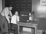 W. J. Pierre, seated, chairman of Junior Chamber of Commerce safety committee, taking driver's test as Lynn Yeatts stands by.