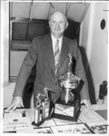 Portrait of R. D. Evans, 08/12/1946. There are three trophies in front of him.