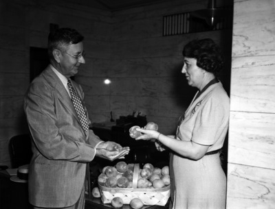 Mrs. Berta Womack, president of the Zonta Club, right, offering three peaches to B. B. Stone, president of the Fort Worth Chamber of Commerce. The club recently started their Eat-a-Peach-a-Meal Campaign to help with farmers' peach surplus. Mrs. Womack is wearing a dress and Stone is wearing a suit. Between them is a basket of peaches on a table.