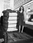 Tarrant County first bale of cotton. Miss Billie Marie Ford, Texas Christian University, shown with first bale of cotton