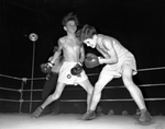 Texas Amateur Athletic Federation boxing tournament. An action shot of Bob McDonald, right, and Ed (Bunky) Stephens in a boxing ring.