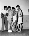 Presley Darnell, checking weight of contestants, left to right, Bobby McDonald, Waco; Joe Hernandez, San Angelo; and Jack Frey