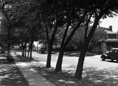 This picture shows some of the estimated 500 shade trees which must be uprooted in the widening and repaving of Hemphill Street from Magnolia Avenue to Biddison Street. Protests over the possible loss of the trees were being planned by a group of property owners headed by C. T. Hodge. City officials hope to save the trees by incorporating a transplanting program in a Works Progress Administration (WPA) project for building sidewalks. The curbs are to be set back and the pavement widened from 40 to 54 feet.
