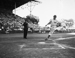 The Fort Worth Cats played the Beaumont Exporters at LaGrave Field, Sunday. Boris "Butch" Woyt, outfielder for the Cats, trotted home the winning run as the Cats shaded Beaumont 5-4. The umpire is standing behind the plate, holding his mask.