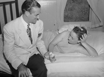 Lone victim of the Showboat fire, Miss Billie Harrell, 24, was visited by her rescuer, Paul Page, orchestra leader at the night club. Miss Harrell suffered numerous bruises and a sprained thumb in a fall down an inside staircase. She is lying on a bed and Mr. Page is sitting beside her. He is wearing a suit and she is wearing a dress. Her right thumb is wrapped in bandages.