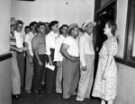 Mrs. D. S. Newborn, Red Cross worker, and group of Government-Issues (GI's) vets eligible for terminal leave pay.
