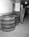 Detective Lieutenant Brown shown inspecting tires recovered from thieves.
