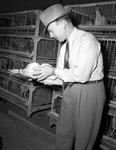 E. D. Parnell, Texas A & M College, inspecting a chicken at a chicken show.