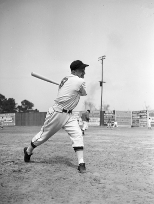 The Fort Worth Cats' twenty-six year old outfielder Steve Kuk is standing on the right side of the plate, ready to take his swings. Kuk has a closed stance and the bat is resting against his back shoulder. Here he is posed after taking the swing.