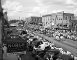 North Texas Fair parade in the downtown streets of Arlington, Texas. Visible businesses include Norge Household Appliances, Arlington Hardware Company, Knapp's Barber Shop, Texas Electric Service Co., Kell Cleaners, Workman's Drugs, Rexall Drugs, Rose & Yates Insurance.