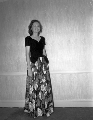 The National Fashion Exhibitors opened its Fall market at the Hotel Texas. Miss Margaret Anne Coffey is modeling one of the pieces from the show. She is wearing a dinner gown with a black velvet jacket and full flowered crepe skirt. She is standing in front of a blank wall.