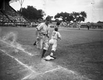 The Fort Worth Cats faced their Texas League rival, the San Antonio Missions, in a Sunday double header at LaGrave Field. In the bottom of the ninth of game one, Monty Basgall, second baseman for the Cats, beat out a close play for an infield single. The Missions' first basemen, number 17, is stretching for the throw.