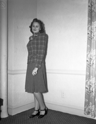 The National Fashion Exhibitors opened its Fall market at the Hotel Texas. Miss Ann Lawrence is modeling one of the pieces from the show. She is wearing a sports suit of nubby wool mixture with a grey skirt and a jacket of red, brown, green and white plaid. She is standing in front of a blank wall. At the far right is a floral print curtain.
