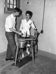The United States Public Health Service (U. S. P. H. S.) Hospital is using occupational therapy wards to assist Navy veterans with acute psychiatric cases. Miss Nola Gayle Terrill, of Fort Worth, Texas, is shown working with one of her patients. They are shown shaping a vase on the potter's wheel. Miss Terrill is a student at Texas State College for Women. She is receiving clinical experience by working at the hospital. She is dressed in uniform. Published in the Fort Worth Star-Telegram evening edition, August 1, 1946.