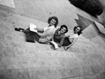 As summer vacation winds down, students are preparing to leave for college. Discussing their plans and campus wardrobe, left to right are Miss Kay Smith, Miss Beryl Nowlin, and Miss Mimi Hicks. The girls are siting on steps, reading. Miss Smith is dressed in a collared blouse, sweater, and a skirt. Miss Nowlin is wearing a tweed blazer and a skirt. Miss Hicks is dressed in a sweater and a skirt. Published in the Fort Worth Star-Telegram morning edition, September 1, 1946.