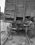 Jack Liles (left) and J. H. Hazlewood, Handley, Texas, repairing a 31 years old boxcar in a railroad repair shop.