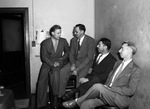 Four war correspondents are gathered together one year after witnessing the Japanese surrender aboard the battleship Missouri in Tokyo Bay. Pictured left to right, are Lee Van Atta, Charles K. Boatner, Sam E. Kinch, and Robert Wear. All four men work for the Fort Worth Star-Telegram. Mr. Van Atta is a reporter with the International News Service (I. N. S.). He is dressed in a double breasted pinstripe suit. Mr. Boatner is wearing a double breasted suit. Mr. Kinch is dressed in a double breasted, striped suit. Mr. Wear is wearing a pinstripe suit. Published in the Fort Worth Star-Telegram morning edition, September 1, 1946.