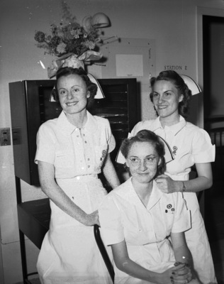 Miss Mattie Lee Black, Miss Irma Brown and Miss Juanita Green all work the same nightly shift at City-County Hospital. They live together at 1515 Jennings Avenue and all graduated from the hospital's nursing school in August, 1939. Miss Brown is sitting in a chair and Miss Black and Miss Green are standing on either side of her. They are all wearing their nurse's uniform. Behind them is a filing cabinet, on top of which there is a bouquet of flowers.