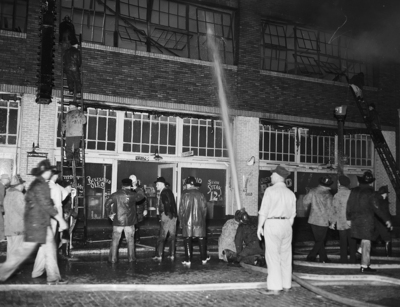 Image shows Firemen are spraying water on a burning two story building that houses the Courthouse Market. The fire began on the roof around midnight and was spotted by Tracy Doyle and Charles J. Flynn. The three alarm blaze, early Saturday morning attracted hundreds of spectators. All available off-duty firemen were summoned along with the regular force at twelve stations. Several firemen are on the hose while others climb ladders to the second story. Their fire trucks are in the background. Published in the Fort Worth Star-Telegram evening edition July 27, 1940.