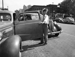 The Fort Worth Star-Telegram is running a series on driving safety. Playing the role of a careless driver "Joe Blow," the traffic hazard, is Marcus Curd. He is shown at his parked car, opening the door wide into oncoming traffic. Mr. Curd is dressed in a hat, button-up shirt, necktie, and trousers. Published in the Fort Worth Star-Telegram morning edition, September 2, 1946.