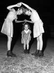 Joanna Taulman, 7, ice skated under a "human bridge" made by Frances Aneta Gee (left) and her sister, Shirley Ann. Frances and Shirley are shown demonstrating the "human bridge" while small Joanna is knelt down between them. Frances and Shirley are wearing matching floral dresses while Joanna wears a bow and a dress with small triangles on it. The sisters are smiling at the camera.