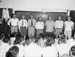 Texas Christian University (T. C. U.) football players and coaches (left to right) Fred Taylor, end and co-captain; Hub McQuillan, scout and assistant coach; Walter Roach, end coach; Dutch Meyer, head coach; Clyde Flowers, line coach; Abe Martin, assistant coach and Henry Rose, tackle and co-captain.