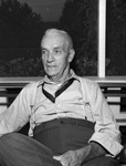 Henry Lee Wight is a veteran railroad conductor with the Santa Fe Railway. As one of the oldest conductors, he is ending his forty-five years of service with a well-deserved retirement. He will soon take his wife on a vacation to Chicago, Illinois, Michigan, and Minnesota. Mr. Wight is shown sitting on his enclosed front porch as rain falls outside. He is dressed in a striped shirt, suspenders, and trousers.