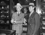 Fort Worth Cats' Jay Haney, left, outfielder, and Bob Gorbould, infielder, make their felt hat selections early in preparation for official felt hat day in Fort Worth, Texas. The ball players chose from a wide selection at a hat shop. Haney chose the modified western style to go with his double breasted suit. Gorbould went with the snap brim style to match his double breasted pinstripe suit. There are more hats stacked along the shelves on each side of the men.