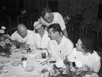 Hicks Field. Shown at a table in new mess hall, left to right, (Seated) Major B. S. Graham; Mrs. E. P. Van Zandt, Mr. Joe Payne, Greenville, S. C., the new cadet, and Mrs. Robert B. Voilette. Standing Mr. P. R. Bonds. Fort Worth Star-Telegram Evening Edition. 1940-07-29.