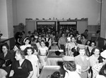 Crowds at the formal opening of the new R. E. Cox. & Company store inside the Fort Worth Club building. Shown is a large crowd split into two, coming through the doors of the store. Most of the crowd is made up of women looking around the store. Many are wearing dresses and hats. Some are also holding purses, as well.
