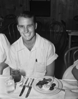 Hicks Field. Photograph of Joe Payne, the new cadet from Greenville, S.C. He is sitting at a table in the mess hall. On the table in front of him are plates with food and glasses with beverages. Fort Worth Star-Telegram Evening Edition. 1940-07-29.