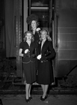 Mrs. J. W. Herbert and her 2 daughters (left) Joyce, Mrs. Herbert, center, and Joanne (right). They are posing for a photograph before entering a train car. They are dressed in skirts and blouses. Joanne is wearing a blazer on top of her blouse. The ladies are holding flowers while Mrs. Herbert has her flower attached to her dress and a big bow on her head. They are smiling as they pose for the photograph.