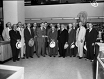 Cox's. Opening. Fort Worth Club governors (from left) W. P. Bomar, Stanley Thompson, F. J. Adams, Raymond C. Gee, R. K. Hanger, W. K. Stripling, V. M. Cox, R. E. Cox, R. E. Cox Jr. R. A. Cox, R. E. Harding, Edwin E. Bewley, Ed H. Winton, John Halsell, Dr. Webb Walker, Amon Carter, Tom B. Carvey and Mayor Carnrike. The men are standing in rows and are wearing suits and ties. The men in the first row are holding hats in their hands. Some of the men are wearing eyeglasses. They are looking towards the camera. In the background, there are walls and pillars and a circular fan at the back on the wall