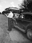The Fort Worth Star-Telegram is running a series on driving safety. Playing the role of a careless driver "Joe Blow," the traffic hazard , is Marcus Curd. Motorcycle officer Roy Gibson is writing Joe Blow a ticket. While the officer's back was turned, Joe stuck out his tongue and made a face. The officer caught the gesture and remarked that Joe would learn to respect the dignity of the law. Officer Gibson is dressed in his uniform. Mr. Curd is wearing a hat and a button-up shirt. Published in the Fort Worth Star-Telegram evening edition, September 11, 1946.