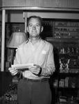 Otis R. McCorstin is a veteran of the United States Army Air Force. He was discharged in 1943. He is shown displaying his GI terminal leave pay check, the first one received in Tarrant County, Texas. Mr. McCorstin is dressed in a striped button-up shirt and trousers. He is inside a drugstore, near the toiletries aisle.
