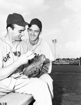 Catcher George Pfister, left, and Pitcher John Van Cuyk, of the Fort Worth Cats, talk over plans for Tuesday night's playoff game at LaGrave Field with the Dallas Rebels. Pfister is wearing a catcher's mitt and is gripping a baseball. Van Cuyk is sitting behind him on the bench. They are dressed in the Cats' road uniforms. The Cats and Rebels are matching up in the final round of the playoffs. The Cats finished first in the division with a record of 101-53. The Rebels finished second with a 91-63 record, ten games behind the division leader.