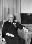 Mrs. W. C. Dugger of Austin, Texas is celebrating her eighty-sixth birthday. She arrived in Fort Worth, Texas at the Municipal Airport after her first trip on an airplane. The trip was a present from her grandson, Sam Dugger Junior. The flight lasted only a little more than hour and Mrs. Dugger suffered no ill effects. Mrs. Dugger is shown sitting in a chair by the window. She is wearing a button-up blouse, skirt, and a corsage. She is staying the week with her son and daughter-in-law, Mr. and Mrs. Sam Dugger.
