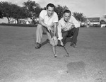 Golfers Jay Lowery (left) and Miles Falls, who play for the Worth Hills championship, test the putting surface of the greens. They are kneeling with one knee and holding the golf clubs with one hand. Published in the Fort Worth Star-Telegram morning edition.