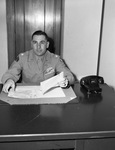 Lieutenant Colonel Maurice K. Schiffman is assuming the charge of the Fort Worth area of the Organized Reserve Corps. He is veteran of six years of Army service. He fought in the European Theater during World War II, where he commanded the 3rd Battalion 255th Infantry. He holds the Silver Star, Bronze Star, and the Purple Heart. Colonel Schiffman is sitting at his desk, dressed in his military uniform.