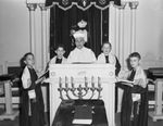 The Congregation Ahavath Shomom will celebrate the Jewish new year, Rosh Hashanah, with chant services on Thursday and Friday, September 26 and 27. In charge of the services is Cantor Abraham Friedman. Soloists who will appear in a special choir is organized for the services. Left to right, Jay Weinstein, Gary Luskey, Cantor Abraham Friedman, Abraham Cohen and Joseph Weinberg. They are standing around the pulpit, in their religious attire, holding song books and singing. Distinct religious items like the menorah and a Bible are in front of the pulpit.