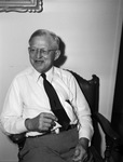 Doctor S. D. Press, of Webster Groves, Missouri, is a member of the World Council of Christian Churches. Dr. Press teaches New Testament and systematic theology at Eden Theological Seminary. He served as president of the school from 1919 to 1941. He is in Fort Worth, Texas to preach his sermon at Saint John's Evangelical Church, Sunday. Dr. Press is sitting on a chair, wearing a dress shirt, necktie, and trousers.