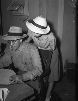 Mr. and Mrs. Ward Bailey are reviewing the results of the county government election. Mr. Bailey is the county Democratic chairman. He is sitting at a desk, looking at a piece of paper. He is wearing a long-sleeve collared shirt, trousers, a hat and eyeglasses. Mrs. Bailey is standing behind him, looking over his shoulder. She is wearing a collared blouse, a skirt and a hat.